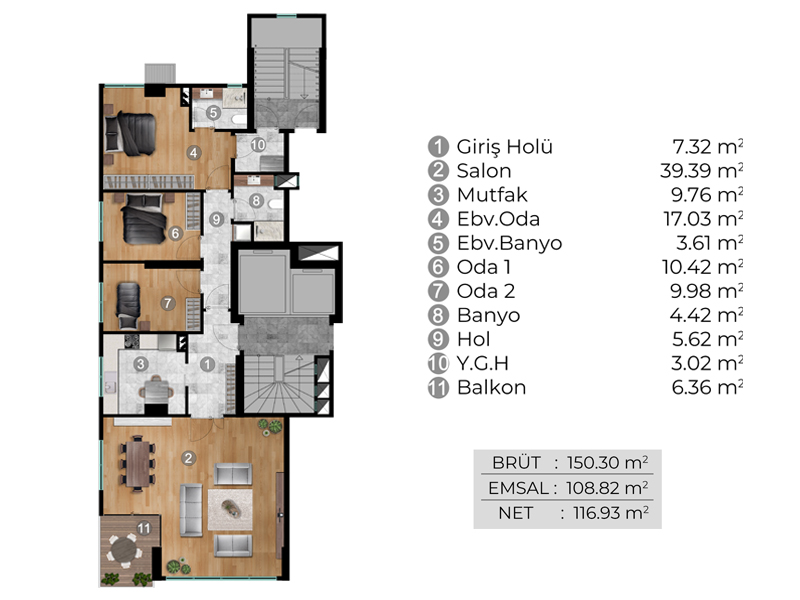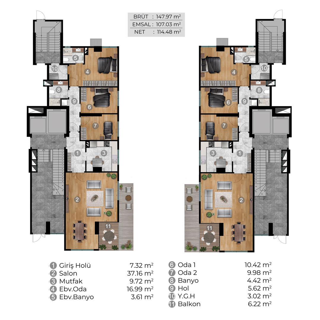 Doğal malzemelerle şekillenen rafine dokular, tavanlar ve geniş camlarla bütünleşerek yaşam alanlarına sıcaklık katıyor. Özel tasarım parkeler ve seçkin detaylar, her mekanda benzersiz bir zarafet ve dokunsal zenginlik sunuyor.