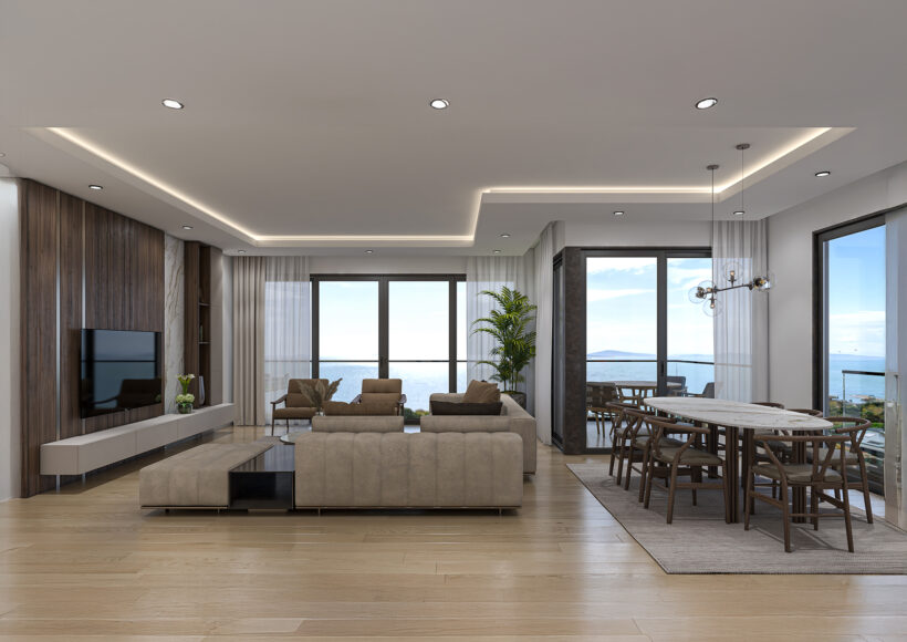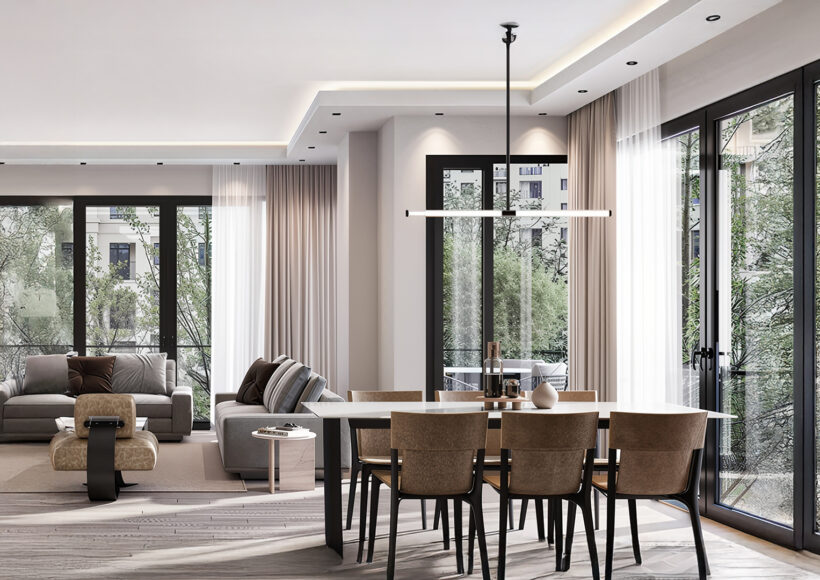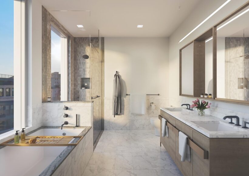 Featuring a refined palette of natural materials, the open living spaces provide a warm counterpoint to the soaring ceilings and full-height windows. Custom herringbone floors and hand-selected stone bring a rich tactility to the rooms.